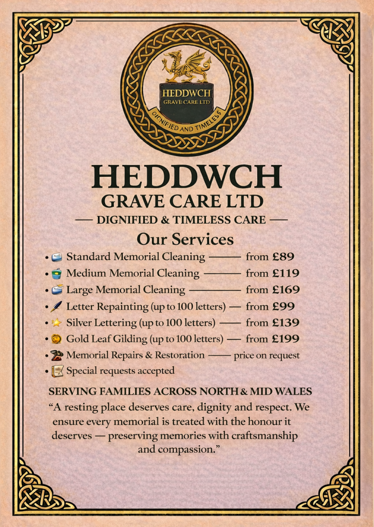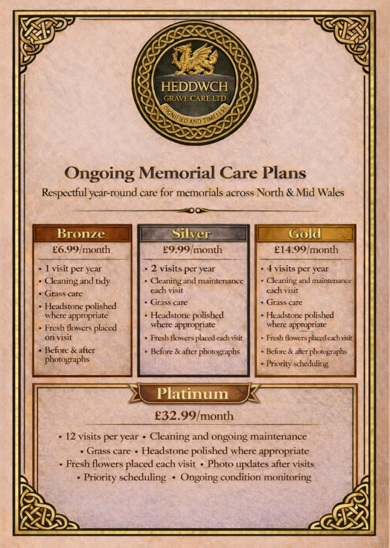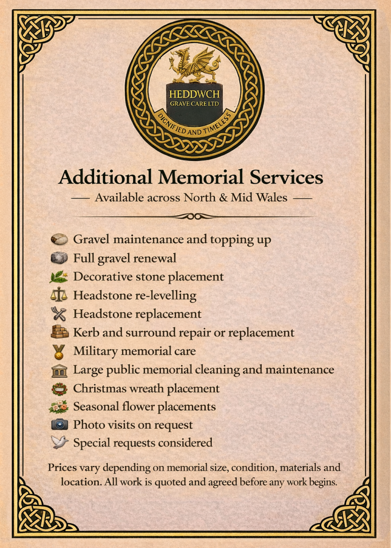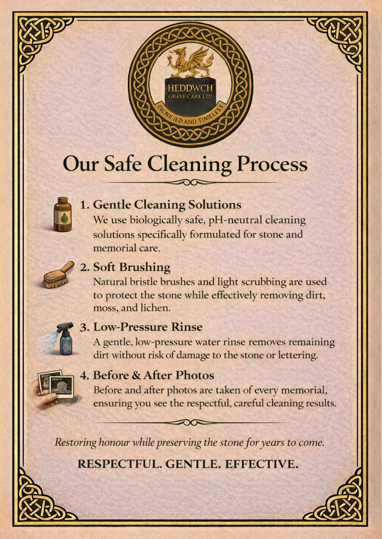 We provide careful, stone-safe memorial cleaning for families across North & Mid Wales. Every memorial is different, so we tailor our approach to the material, age and condition of the stone.